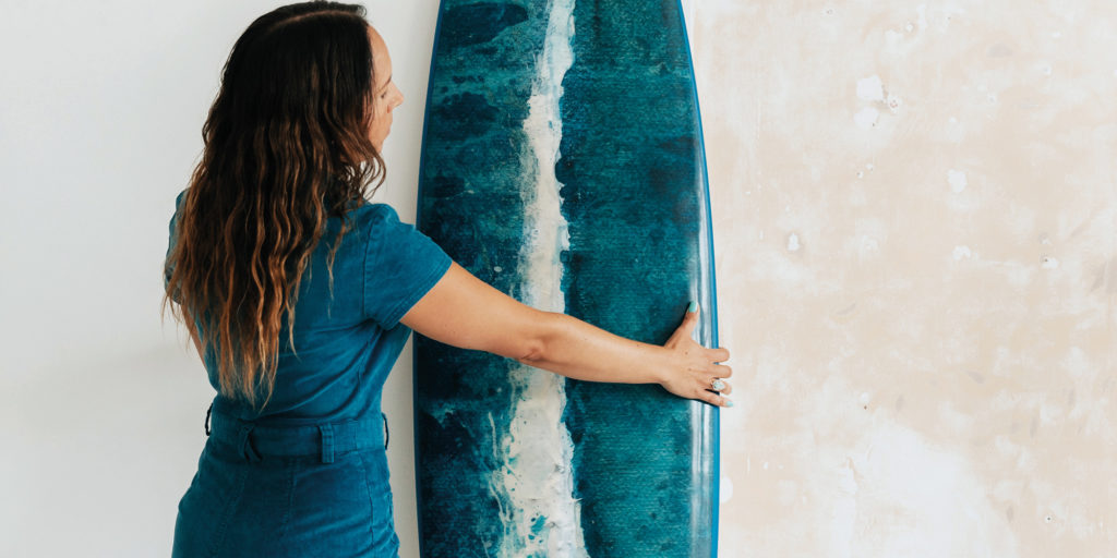 Exhibiting across Cornwall and beyond, from intimate coastal galleries to international art fairs, has brought Gemma Lessinger into conversation with people who connect to the sea in countless different ways. “Today, my work continues to evolve. From large-scale commissions and repurposed surfboards, to collaborations with brands and makers who share my values, I’m constantly exploring new ways to connect people with the ocean. The sea has always been my sanctuary; through art, it’s also become my language.”
