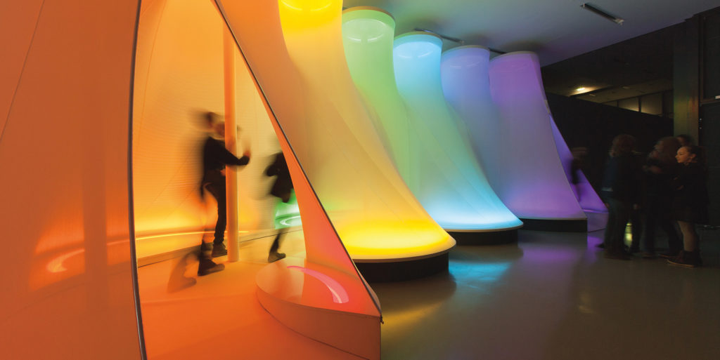 The exhibition includes Spectrum: An Afterthought (1975), a vivid passageway of coloured zones constructed from aluminium, neon and stretched fabric, accompanied by sound and scent to heighten its sensory impact. Also featured is Three-dimensional Rug (1971), part of a partial recreation of her New York Live-In Environment, alongside sculptures, drawings and models from the Lithuanian National Museum of Art.