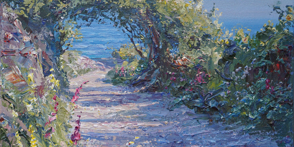 An avid en plein air painter, Mark is a familiar sight on the clifftops of West Cornwall, capturing the coast in all its rugged glory regardless of the weather. His latest collection of works are vibrant celebrations of the landscape – where wildflowers, winding pathways, and the distinct textures of blackthorn, gorse and thrift meet the endless blue of the sea beyond.
