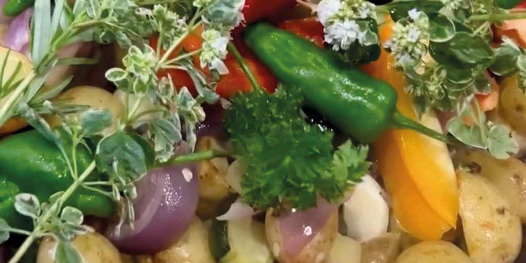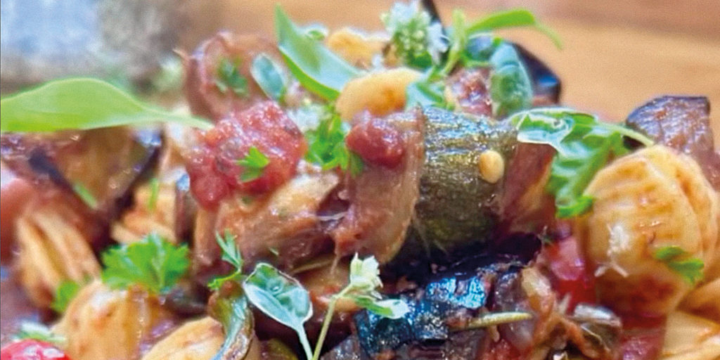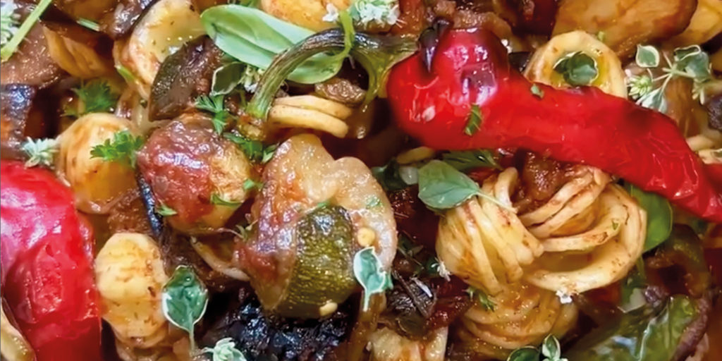 Sunshine spills across the plate in this heart-warming pasta dish, where tender orecchiette meets a riot of roasted vegetables and whole chillies. New potatoes, courgette, aubergine, red onion and garlic are roasted with fresh oregano, rosemary and a splash of balsamic, while sweet, smoky Padron and Friggitelli peppers from Cornish Chillies bring the occasional whisper of heat. Stirred through the tray, the pasta soaks up the rich, flavourful juices, creating a sweet fusion of Italian comfort and Spanish flair. It’s effortless, seasonal cooking that feels as vibrant on the table as it does on the palate – and entirely adaptable if heat, garlic and sweetness are not your thing; you can replace them with standard red peppers.