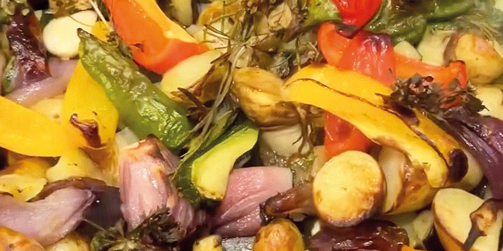 Roasted veggies with whole chillies. Sweet, rich, scrumptious – ideal for the season.