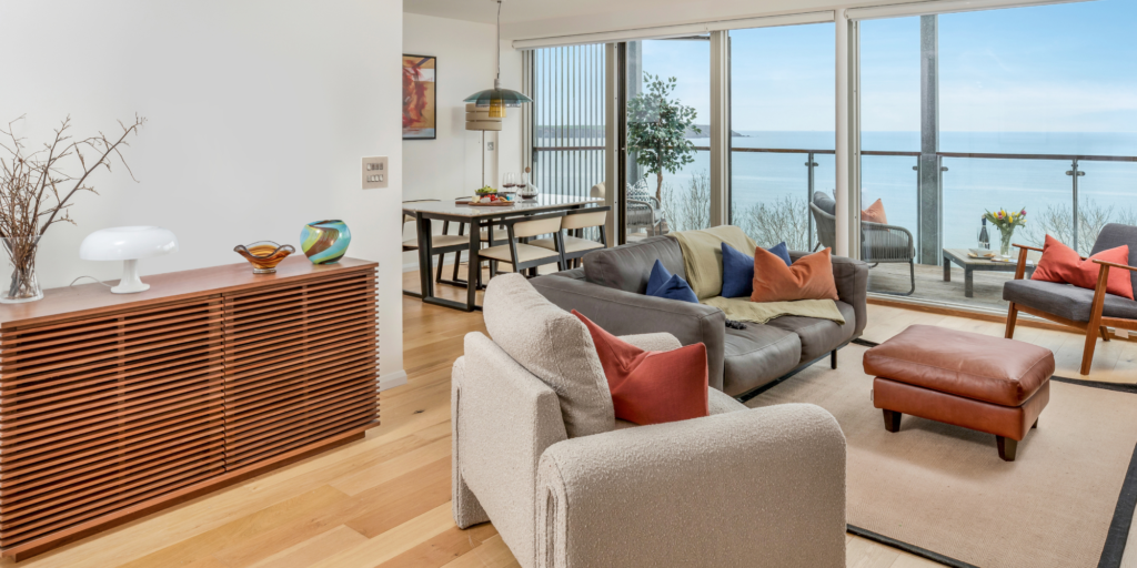 Positioned above south Cornwall’s rugged coastline, Mor Dianc offers panoramic sea views visible from the living area, balcony, dining space, and kitchen. Sunlight floods the chic interiors, creating a serene coastal atmosphere. Breakfasts overlooking the bay can drift into afternoons on the balcony, watching the coastline reach into the distance. Sleeping eight guests, this apartment combines effortless elegance with dramatic scenery, providing a perfect setting to relax, unwind, and immerse yourself in the sweeping beauty of the Cornish coast.