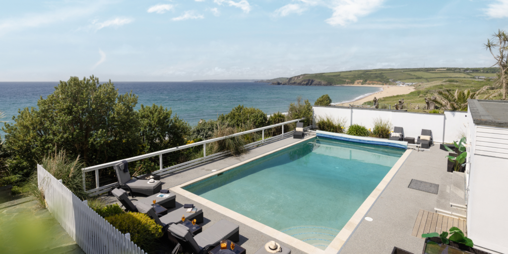 Overlooking Praa Sands beach, Praaloha is a striking coastal retreat where sea views dominate every room, from the living areas and en-suite bedrooms to the kitchen itself. Outside, the ocean stretches to the horizon, with west Cornwall’s rugged coastline as a dramatic backdrop. Sleeping ten, the home invites long, leisurely days by the outdoor pool, in the landscaped gardens, or in the wood-fired hot tub while watching the waves. With a sea-facing gym and contemporary styling throughout, Praaloha is the ultimate luxury escape for families and groups seeking a spectacular seaside experience.