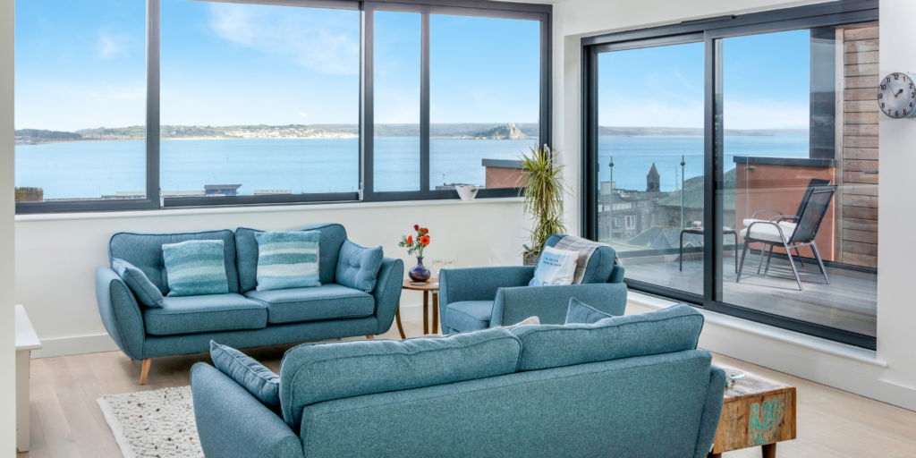 High above Penzance, PZ 360 Apartment 4 offers breathtaking, 360-degree views stretching from Newlyn to Marazion, St Michael’s Mount, and beyond. Located on the fifth floor, the two-story apartment features high ceilings, an open-plan living area, and a terrace perfect for sunset drinks while the town lights twinkle below. Sleeping four, it blends modern comfort with coastal charm. Steps from Chapel Street’s shops, galleries, and restaurants, and a short walk to the promenade and Jubilee Pool, it’s an ideal base to explore Penzance, Newlyn, and take in Cornwall’s iconic sights.